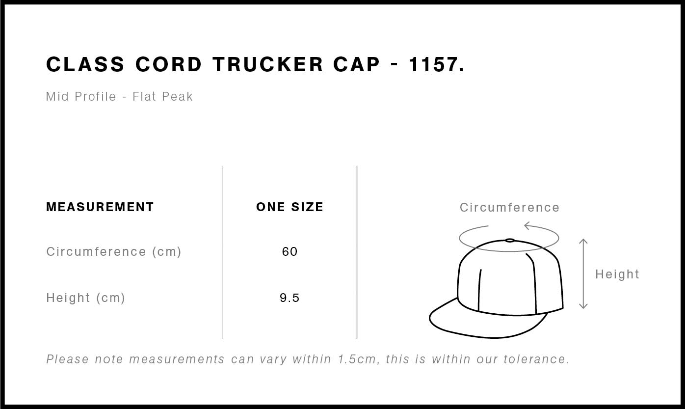 Meet the Class Cord Trucker: Mid-weight, mid-profile cap with a 100% cotton 16-wale partridge cord front and peak, paired with a breathable 100% recycled polyester mesh back. Features include a five-panel design, flat peak mesh back, plastic snapback, and tear-out AS Colour label for comfort and style.