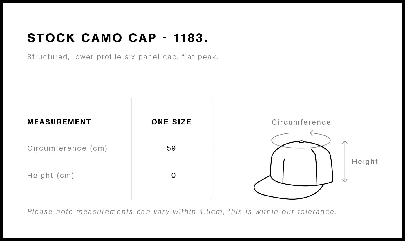 Discover the AS Colour Stock Camo Cap: A high-profile snapback crafted from heavy-weight 100% cotton with an all-over camo print. Features include a structured front, plastic snapback closure, flat peak, tonal under-peak lining, stitching eyelets, and a self-fabric dome. One size fits all with a tear-out AS Colour label for personalised comfort.